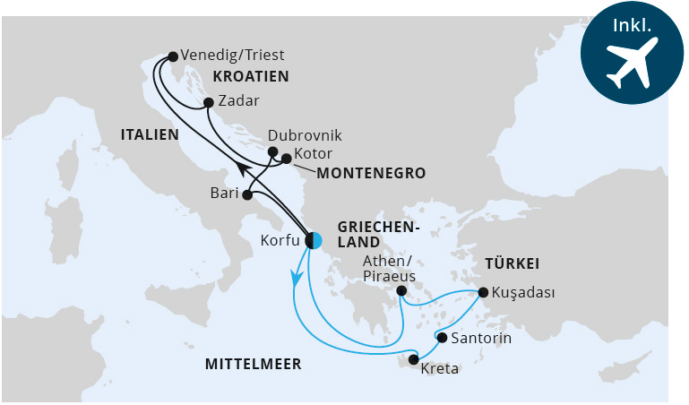 7 Tage Adria ab Korfu 1 ▶ 7 Tage Griechenland ab Korfu 1 ▶ AIDAblu | Mai bis Oktober 2022 ab / bis Korfu ab 1.099 €* p. P. inkl. Flug inkl. 50 € Bordguthaben mit dem Aktionscode REISELUST**